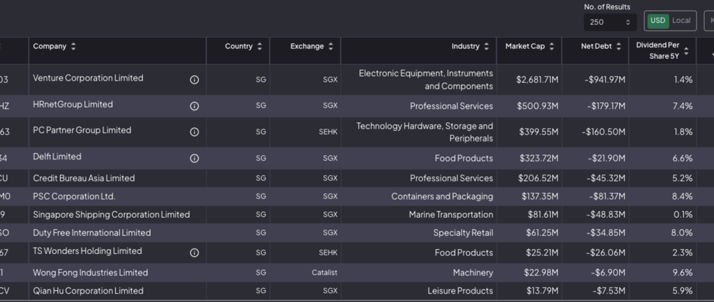 For this year's lists I have similarly used FCF as the main filter, but added dividend and net cash and excluded certain industries. The above shows the list for Singapore stocks.